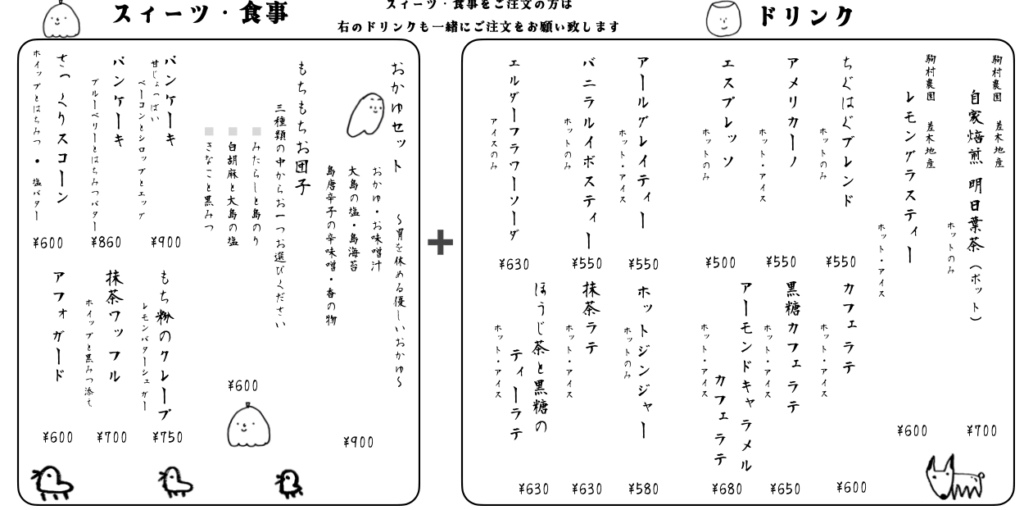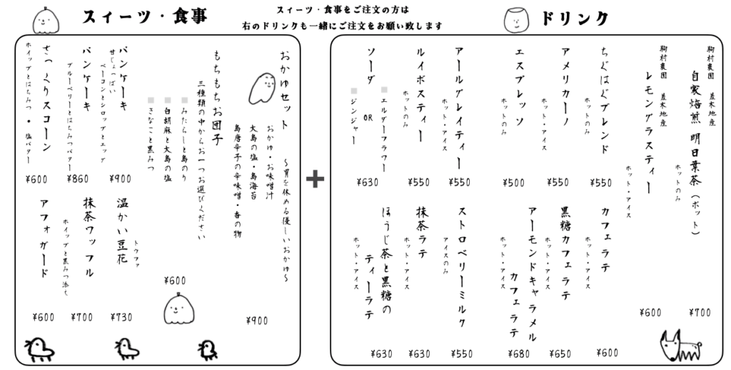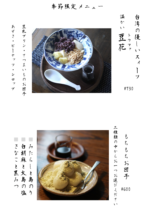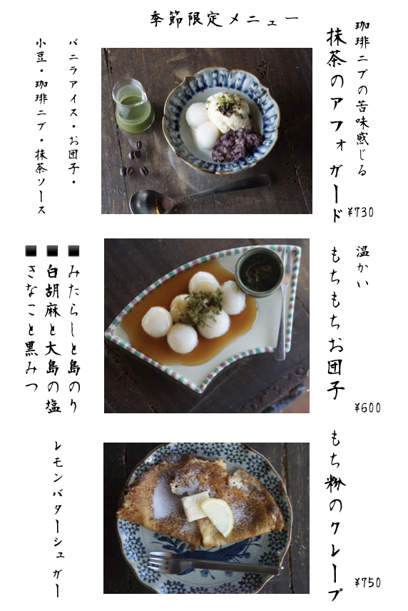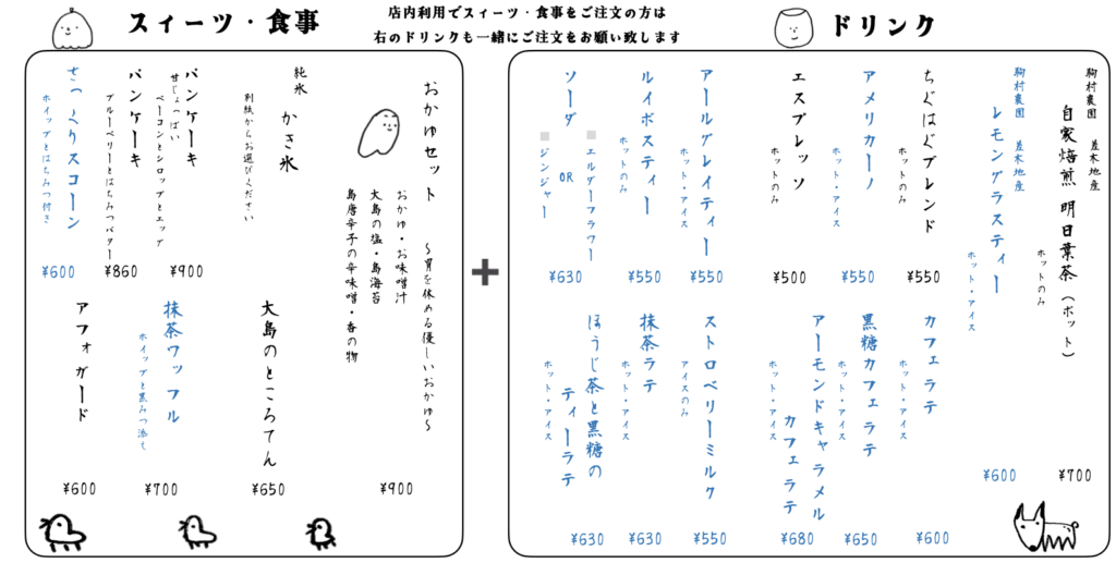 店内ご利用のメニュー 季節限定メニュー キッズメニュー テイクアウトメニュー ※青文字の商品がテイクアウト可能です 雑貨販売 島ぞうり、伊豆大島の作家さんのアクセサリー、流木の一輪挿し、流木の椅子、古着なども販売しております。 雑貨購入のみのご利用も可能です。